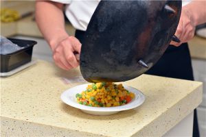 倒入玉米粒,胡萝卜丁,黄瓜丁,不断翻炒,快熟的时候倒入松子。