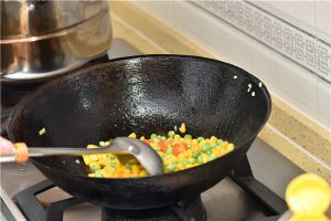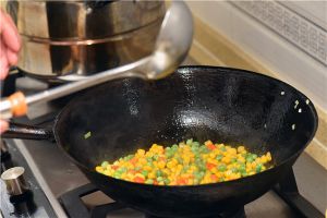 锅做水烧开,先把豌豆放入锅煮里2分钟,再把玉米粒和胡萝卜丁放入锅中再煮30秒~1分钟断生,捞出。