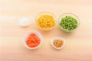 把甜玉米粒和胡萝卜丁,豌豆放入开水中烫三十秒捞出