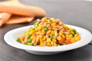 锅入适量色拉油,下入玉米粒,加入盐和糖翻炒。最后加入黄瓜丁,红椒丁和松子仁炒匀后出锅装盘!