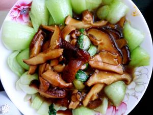 再热油,下姜片炒下,下香菇翻炒会儿。加入一大勺耗油、一大勺生抽,1~2小勺白糖,炒至香菇有点软。用小半碗水淀粉勾芡收汁,摆盘。