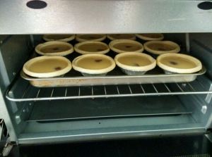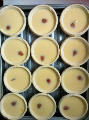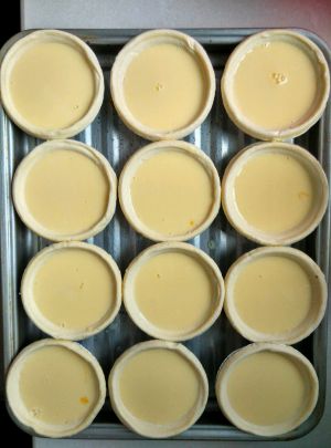 蛋挞皮在烤盘摆放好,将蛋挞水倒入,不要盛的太满,否则烤的时候会溢出。