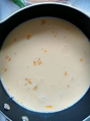 把蛋黄倒入牛奶中均匀搅拌,颜色为淡黄色就对了。蛋挞水就这样完成了。