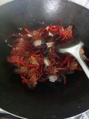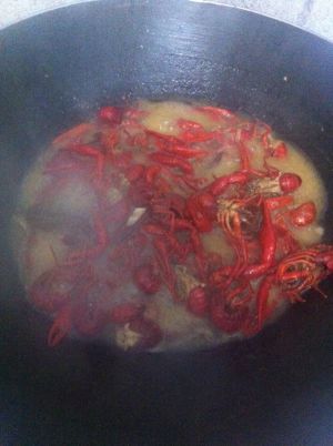 热油下锅葱姜蒜翻炒均匀后。倒入调料,继续翻炒出香味以后倒入小龙虾翻炒,炒至变色以后倒水