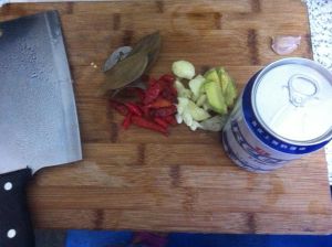 准备好姜片、蒜瓣、香叶、干辣椒、啤酒。