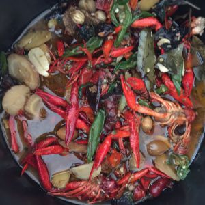 龙虾按门店要求汆水或油炸后放入卤水中卤制7分钟;