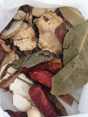 吊汤:将沙姜片、小茴香、草果、陈皮、香叶、香茅草放入鲍鱼袋中放入装有猪骨汤加鸡底汤(吊汤原料1000克)5000克水,太太乐鲜味宝、太太乐天天旺鸡汁、盐、冰糖的桶中;