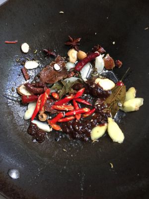 龙虾捞起来之后剩下的油用来炒配料和香料 里面放一点豆瓣酱