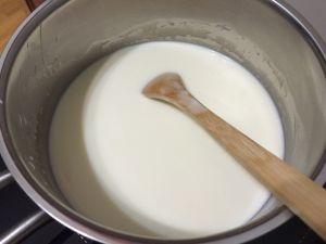 牛奶加热放糖,淡奶油搅拌至融化。