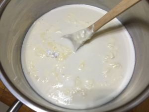 加入适量牛奶,淡奶油,炼奶,并低功率加热加入白糖搅拌,至白糖融化,停火,放置冷却