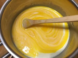 分离出3个蛋黄,打散加入放凉的奶混合液。