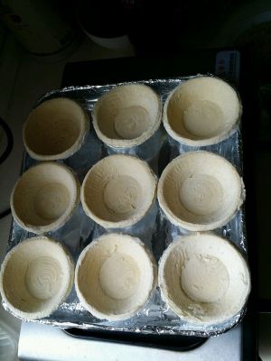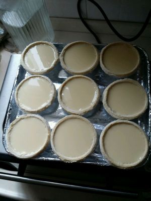 蛋挞皮解冻放烤盘,以上蛋挞液可以做12个蛋挞,因为我不喜欢蛋挞皮,预留三个无挞皮的量。
