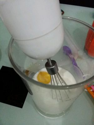 鸡蛋蛋黄蛋白分离,一个一个加入,搅拌均 匀后再放下一个。