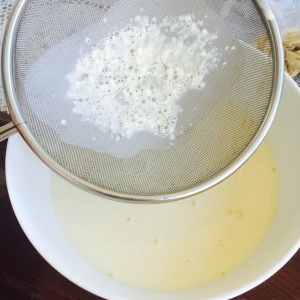混合物晾凉后,加入鸡蛋黄和低筋面粉,混合均匀后,过滤。