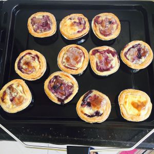 将混合液放入蛋挞皮中,加入蓝莓酱和新鲜蓝莓,放入预热好的烤箱。
