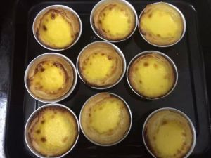 喜欢蛋挞表面有焦糖点的朋友,可以在190度烤18分钟后改220度把烤盘移上一格,再烤4-5分钟。