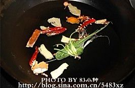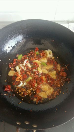 待油热后放入花椒、大料、葱段、蒜片、姜片、干辣椒段爆炒出香味,注意火候,不能火太大。