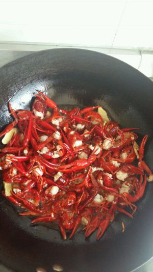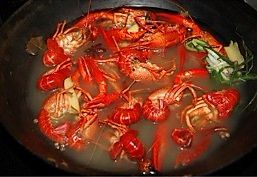 放入小龙虾'加入白酒'酱油少许'翻炒1/2分钟'加入啤酒两罐'适量的水'要求盖住龙虾'等待沸腾'