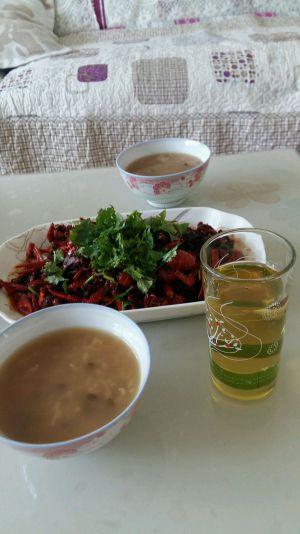还要配上啤酒哦,炖龙虾剩下一杯,我就喝了吧,开始吃咯!