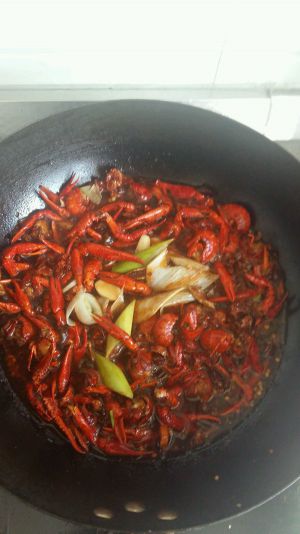 2锅中倒入油,油烧热后,放入大葱片,姜片爆香,倒入小龙虾,加入料酒翻炒,炒干水份,加入豆瓣酱,生抽,胡椒粉翻炒。