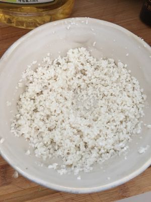 将擀完的大米装碗、放植物油一勺、盐少许、腌十分钟