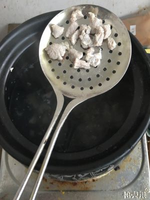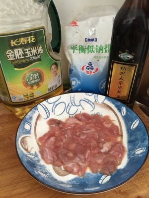 瘦肉切块、加盐、植物油(一勺左右)、黄酒(料酒也可、一勺左右)、腌制十到十五分钟