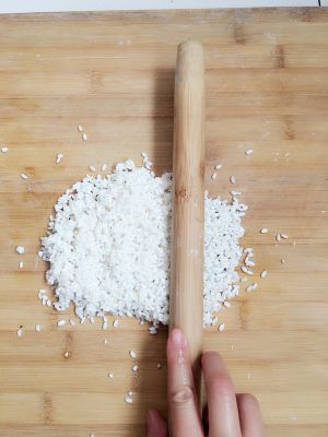 煮肉期间处理大米、将大米倒在面板上、用擀面杖擀碎(也可不擀、但熬的时间会比较长、而且擀完后粘稠度会比较好)