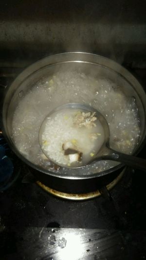 待煮值略粘稠后加入皮蛋和葱根,加入适量盐(ps:香菇,肉,和皮蛋本身都有自带的鲜味,所以无需再放其他调味品)