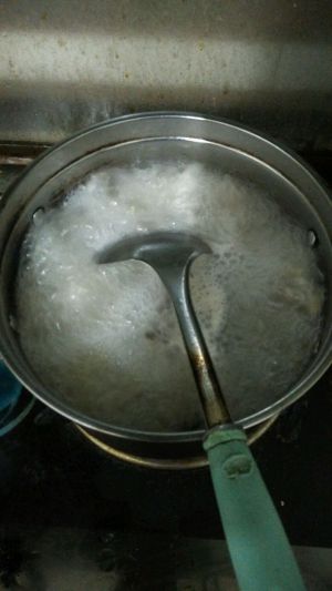 锅中加水3碗烧开,倒入大米煮粥,约30分钟,煮的过程中要间或搅拌一下以免糊底也更好出米油;