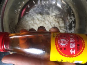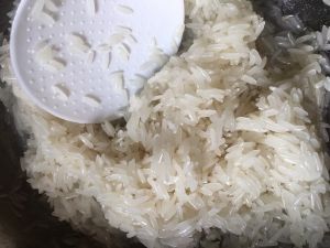 第二天早上起床,锅里倒上开水。把冷冻过的大米拿出来倒进锅里。