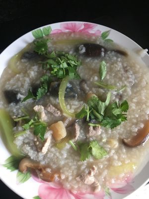 放入肉条搅匀一分钟后在放入皮蛋!煮开后就可以了!