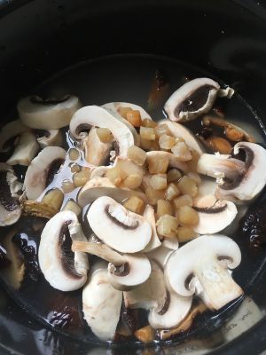 再加入用盐和生抽腌制过的肉。盖上盖子煮,这次煮到沸腾后就开中小火煮。