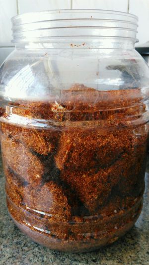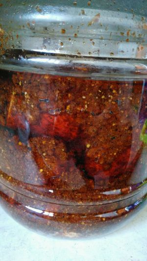 把沾上辣椒面的豆腐依次摆放整齐在密封罐里