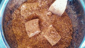准备一个干净大碗 把辣椒面~盐~胡椒面~花椒面~五香粉~生姜搅拌均匀 准备一小碗高度白酒 把豆腐放在白酒碗里打个滚 再放到辣椒面里沾上辣椒面