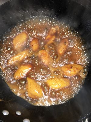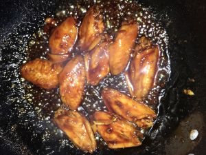 放入姜和蒜爆香,加生抽,然后倒入可乐,可乐要没过鸡翅,大火熬