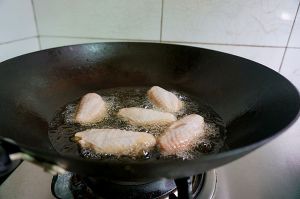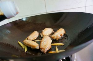 锅里放油(最好用稍微有些深度的带锅盖的锅),下生姜片爆香,放入鸡翅翻炒一下