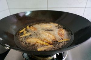 锅里放少许油,油热后放入鸡翅,先煎至反面金黄。中途用锅铲翻动下,以免粘锅了。。。
