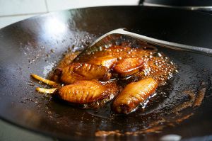 下腌好的鸡翅根,翻炒,炒到表面金黄色。