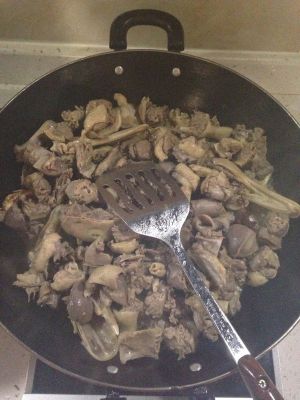 放入菜油,等油热后,将花椒、八角、山奈和鸭子放入锅炒。将鸭子的水分炒干。