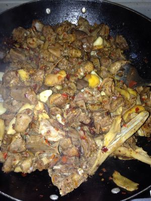 放入准备好的鸭块翻炒,加入适量料酒
