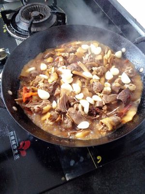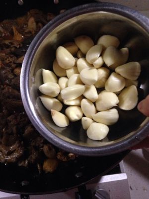 不断翻炒后,水开始涨,放入大蒜、土豆(香菇)。市场翻炒。