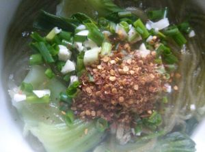 煮好之后把红薯粉装在碗里 把准备好的葱蒜末还有辣椒面放在上面