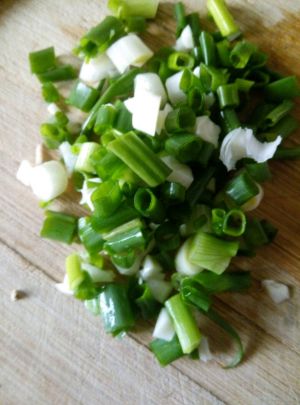 将蒜头、香菜、香葱、小米椒剁碎和切段,进热油锅爆香后,捞出备用。