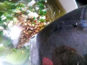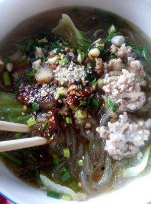 热油,下猪肉末炒干水份,下水或高汤,烧至适量的汤,下辣椒,酱油,盐,芝麻,花椒油,醋,调好汤水,到自己喜欢的口味。