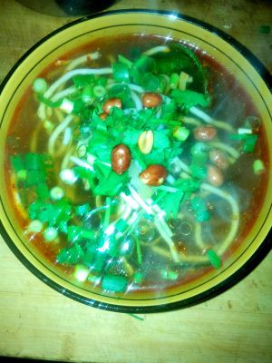 倒入熬好的酸辣汁,再铺上熟花生,撒点葱花、蒜末、香菜、白芝麻即可。 酸辣开胃,真美!