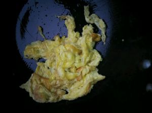 鸡蛋打入碗里,搅拌均匀(我忘拍照了) 锅内放入适量油,油热,倒入鸡蛋,煎至两面金黄,弄碎,盛出备用