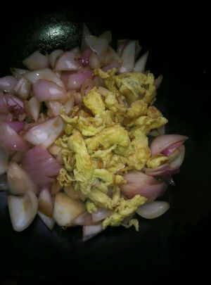 再倒油加热,倒入葱头和榨菜炒至葱头微微变软,倒入炒好的鸡蛋,加入鸡精.味精.盐(少许,因为榨菜带咸味),糖调味即可出锅。
