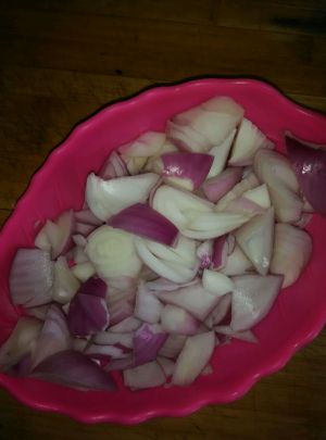 洋葱切条,用生粉涂抹备用(涂生粉是防止洋葱变黑)。