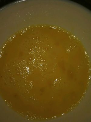 鸡蛋打碎,搅拌均匀,加料酒(可让鸡蛋变松软)。