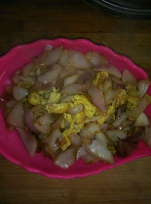把洋葱放入锅内,翻炒一会,下入鸡蛋,放入大概小半勺盐,翻炒均匀即可